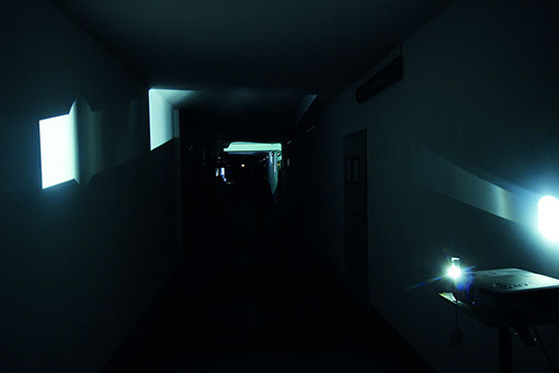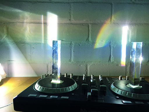 Die Installation thematisiert die Digitalisierung. Eine digitale schwarz-weiß Animation wird durch Beamer und Prismen in ein farbiges analoges Lichtspiel umgewandelt.