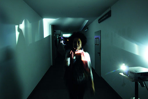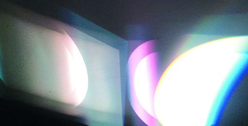 Die Installation thematisiert die Digitalisierung. Eine digitale schwarz-weiß Animation wird durch Beamer und Prismen in ein farbiges analoges Lichtspiel umgewandelt.